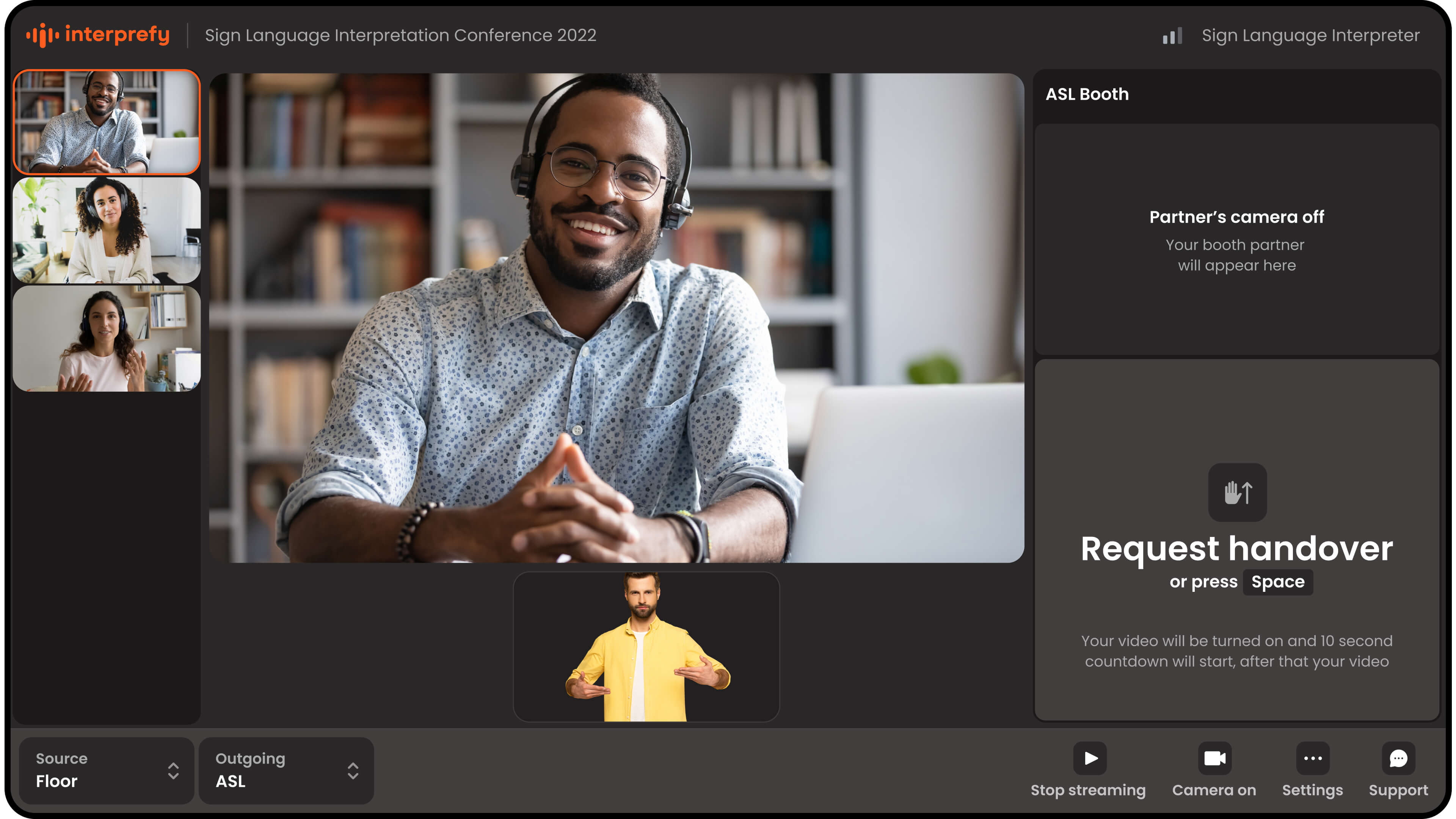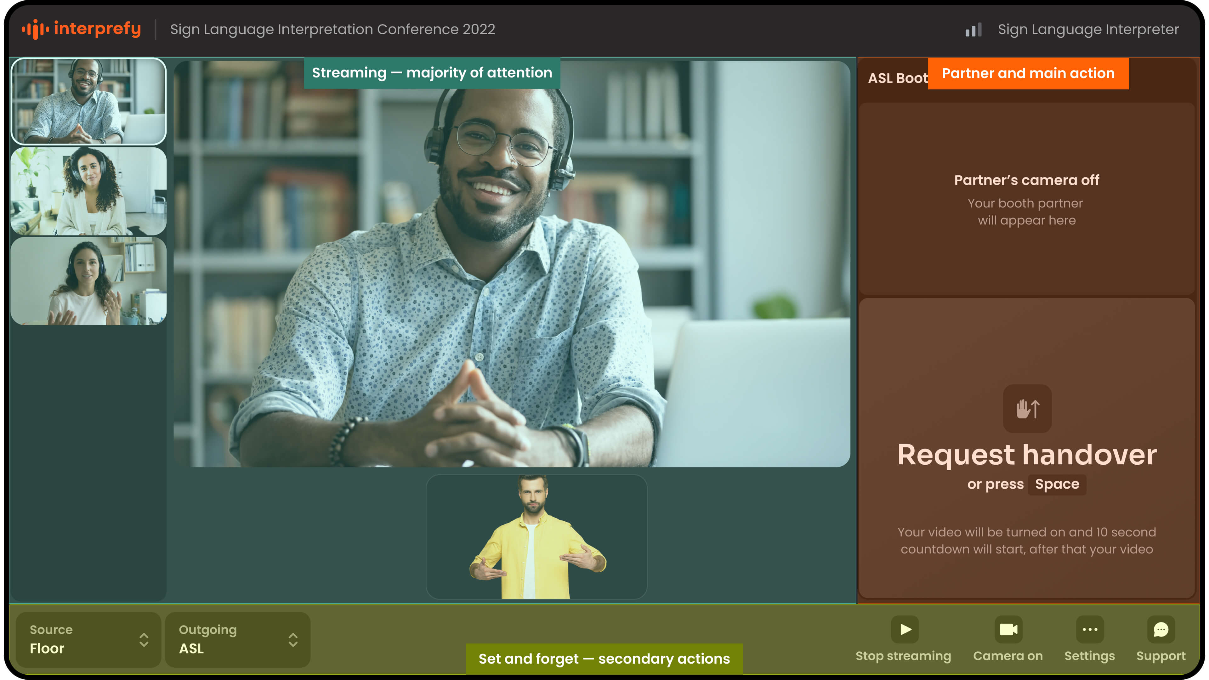The handover between interpreters is usually a part where things might go wrong, so it has to be treated with caution. We combined it together in one block — that allows them to focus their attention, but still keep the context on what's going on during event.