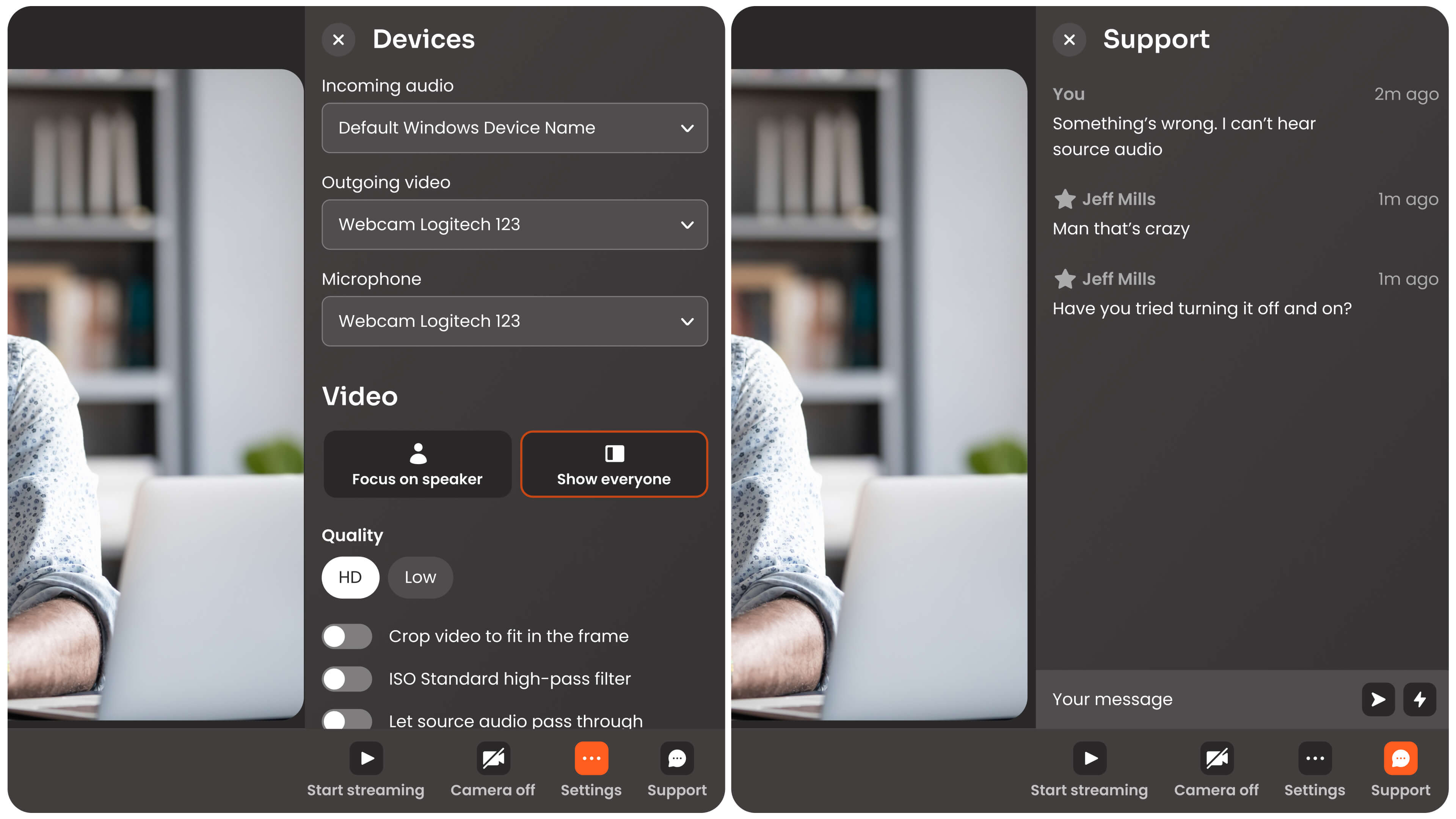 Simultaneous interpretation is a job that requires a high degree of focus. We decided to split the interface into three sections with a focus on speakers and large accessible primary action.